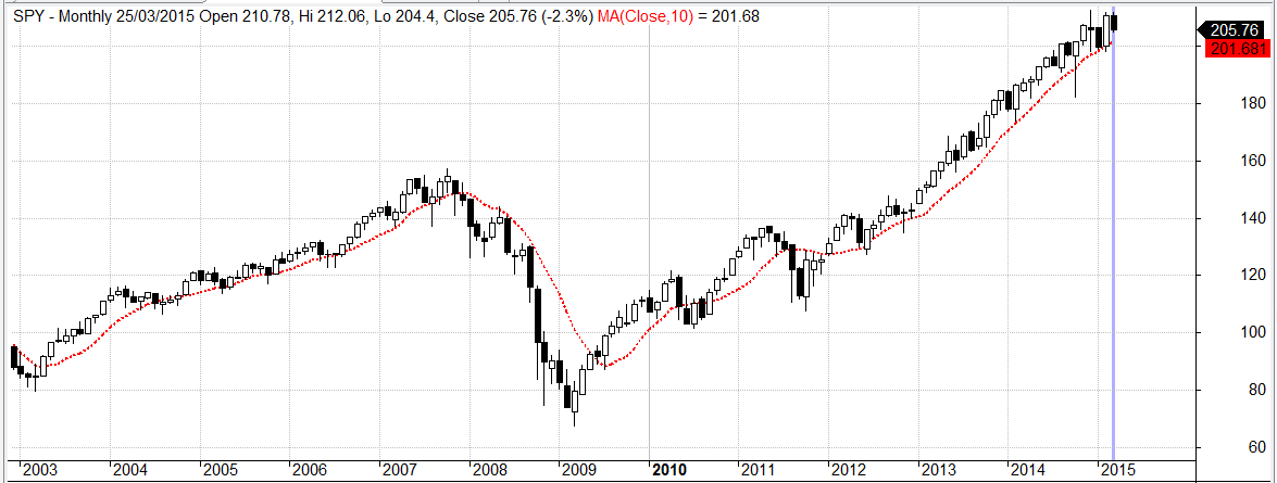 Este sistema compra y vende muy pocas veces, lógicamente. En este grafico mensual se ve el SP500 comparado con su media de 10 meses.