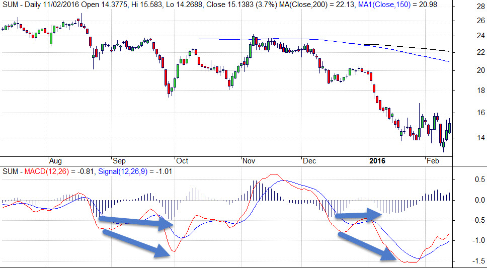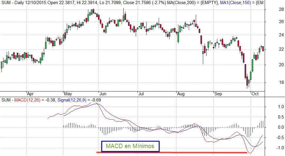 En este caso, vemos que el valor SUM va bajando durante meses, hasta que el MACD llega a un mínimo por debajo de sus mínimos de los últimos meses.