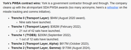 York Space es una de las principales fabricantes de satélites NewSpace, que sobre todo trabaja con la SDA y la Space Force con satélites militares, ahora mismo tiene una capacidad de producción anual de 300 satélites, pero con la salida a bolsa espera mejorar su producción a cerca de 1000 satélites anuales.