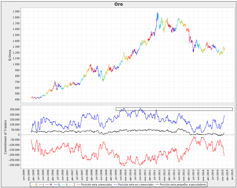 Vamos ahora con el oro. La posición de los grandes especuladores es larga, muy larga. ¿Por qué vamos a ir en su contra si son los que están mejor informados? Si no empiezan a cerrar largos, yo tampoco los cerraría, por si acaso.
