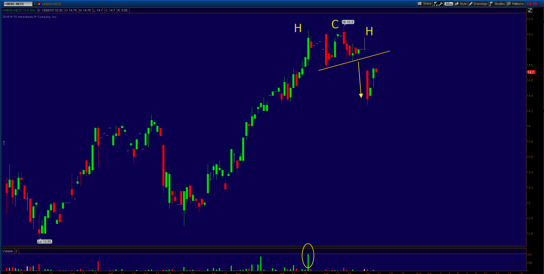Hay que tener en cuenta que este gráfico está al revés que el anterior. En mi caso, siempre coloco el vencimiento más cercano en el primer lugar del spread, Julio - Diciembre. En el gráfico de MRCI, aparece Diciembre - Julio. Según mi método, hay que vender el spread HE NZ5. Desde el otro punto de vista, habría que comprar el spread HE ZN5. Es lo mismo, pero hay que tener claro qué es lo que se quiere hacer.