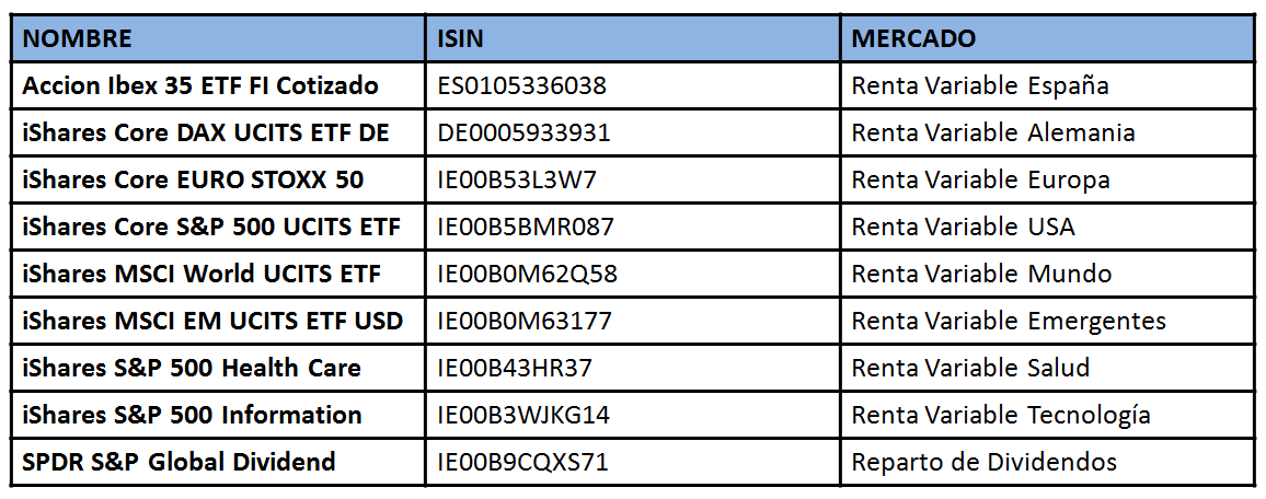 En el mercado existen más de 8.000 ETFs con los que poder trabajar, no obstante, te he dejado una relación de algunos de los más utilizados, filtrados por mercado de referencia: