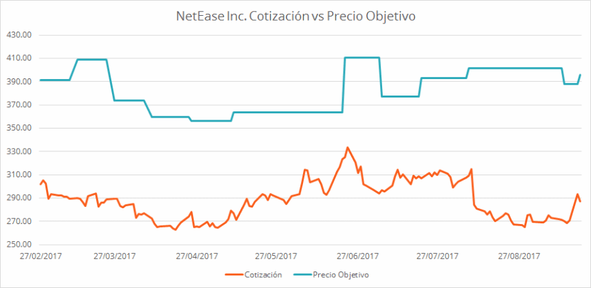 El ADR de NetEase finalizaba 2015 con un valor de 181.24$, cuando mes y medio después habría retrocedido hasta los 133.13$. Intentó remontar y volvió a esta cifra a finales de abril de 2016. Desde entonces la acción ha subido un 116% desde los 133.14$ del 27 abril de 2016 hasta los 287.28$ del 19 de septiembre de 2017.