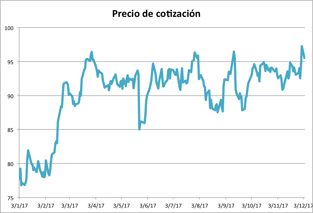 El siguiente gráfico muestra la evolución del precio de cotización de las acciones de Tiffany en lo que llevamos de año natural. En él, podemos observar como su cotización ha evolucionado positivamente con un aumentado de más de un 22.5% desde principios de enero de este mismo año hasta el cierre del pasado lunes día 4 de diciembre. Esto significa un incremento de casi 18 dólares por acción.