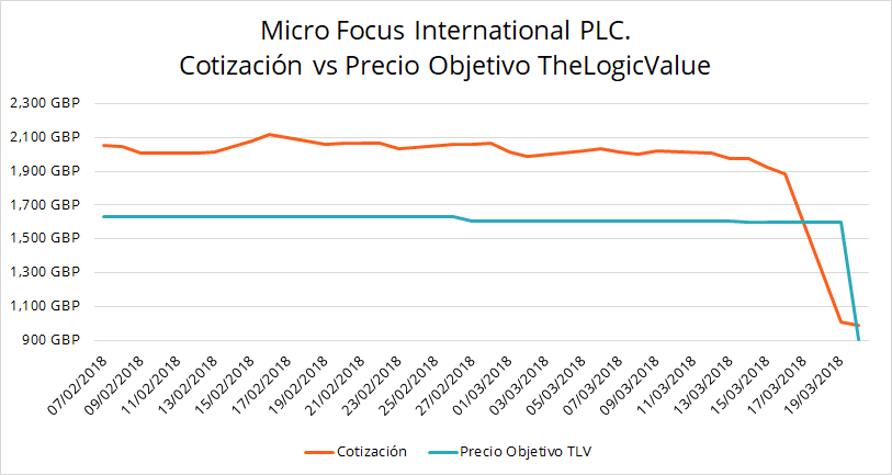 Con estas nuevas estimaciones, en TheLogicValue reducimos el Beneficio por Acción esperado para Micro Focus International PLC para 2018 hasta los 49.16 peniques unido a una rebaja del crecimiento anual de este a largo plazo del 3.90%. Con todo esto, en TheLogicValue obtenemos un precio objetivo de 902.84 peniques, inferior a la cotización con la que cerraba el martes 20 de marzo, 991.40 peniques.