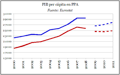Finlandia tiene un mayor PIB per cápita que España, y lo que es más importante aun, las predicciones estiman que éste se recupere de forma más rápida que en el caso español. Y no es que este país haya salido indemne de la crisis, ya que, tal y como se ve en el grafico 2, su caída ha sido superior a la que se da en España.