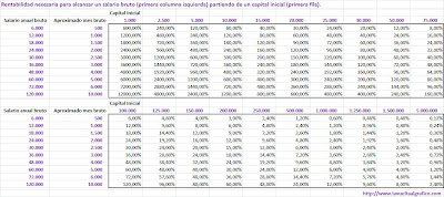 En la tabla que puedes ver más abajo tienes un salario bruto anual en la primera columna de la izquierda y qué salario mensual correspondería a ese salario bruto en la segunda columna. Por otro lado, en la primera fila tienes un capital inicial y en las siguientes, qué porcentaje tendrías que ganar al capital inicial en un año para alcanzar el salario bruto anual correspondiente.