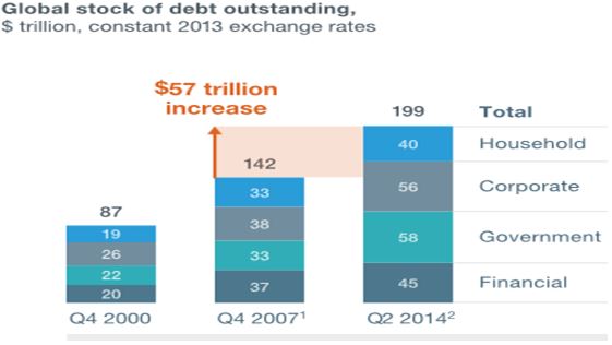 Los efectos secundarios de las constantes expansiones monetarias han generado una insostenible carga de deuda en la economía global acentuado en las economías emergentes en las cuales se ha duplicado desde el 2007. La suma total asciende hasta los 57 trillones de dólares, sí han leído bien trillón, acompañado de 18 ceros, lo que supone un crecimiento anual compuesto del 5,3% debido principalmente a gobiernos y compañías no financieras.
