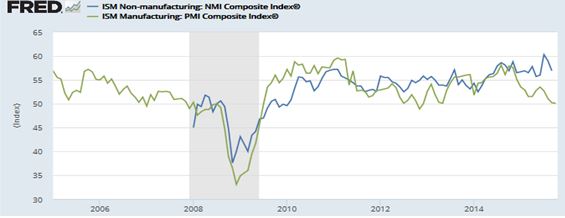 Si nos centramos en los mercados, no atisbamos una señal alarmante de cambio de tendencia, si bien cierta desaceleración. Los indicadores adelantados no cruzan a la baja el umbral 50 y en Estados Unidos, un indicador muy correlacionado con la bolsa, las peticiones de desempleo continúan cayendo después del máximo de 2009. De la misma manera, el gap que podemos ver el gráfico 2 entre el ISM manufacturero y no manufacturero se debe principalmente a las compañías relacionadas con las materias primas ralentizando el sector industrial.