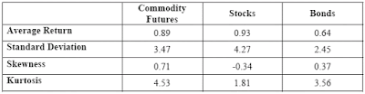 Así mismo, respecto a otras medidas estadísticas, la distribución de los retornos del índice de futuros de materias primas mostró una simetría positiva (frente a la simetría negativa mostrada por las acciones) y una mayor curtosis (cuadro sacado del primer estudio y publicado en el mismo link que el anterior, muestra retornos mensuales).