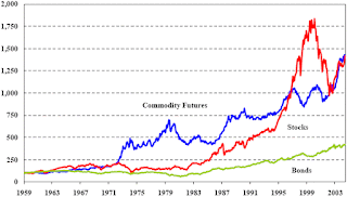 Cuando lo compramos con otras clases de activos, destaca que el índice de futuros de materias primas mantuvo una rentabilidad similar a la de las acciones pero con una desviación típica inferior (imagen sacada del primer estudio y publicada en este link).