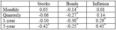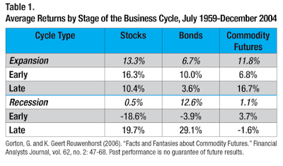 Es interesante así mismo que haya poca correlación entre los retornos de las tres clases de activos, lo que indica que la inversión en un índice de materias primas como el del artículo tiene efectos diversificadores sobre la cartera (cuadro sacado del primer estudio y publicado en el mismo link que el anterior, muestra retornos mensuales).