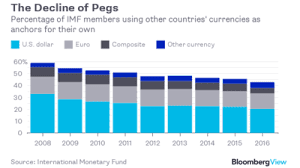 Aunque cada vez haya un menor porcentaje de divisas con algún tipo de peg,en 2016 más del 40% de las divisas del mundo tenía algún tipo de vinculación con otra. La mitad de ellas, con el USD.