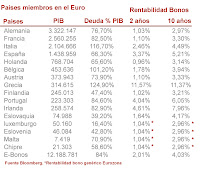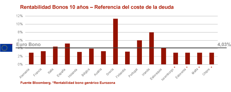 Para averiguar cuál sería la rentabilidad de estos E-bonos hemos hecho algo muy sencillo: calculamos una media ponderada de las rentabilidades de la deuda de cada país miembro en función de su aporte al PIB total de la zona euro. La rentabilidad obtenida sería del 4,03% para un E-bono a 10 años.