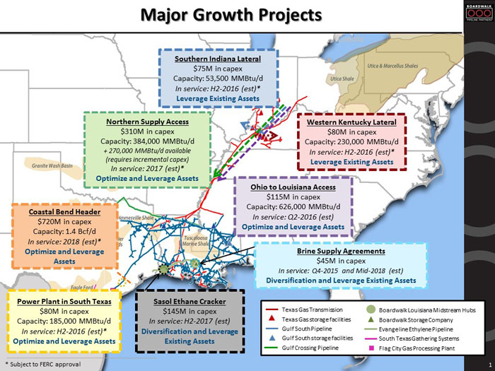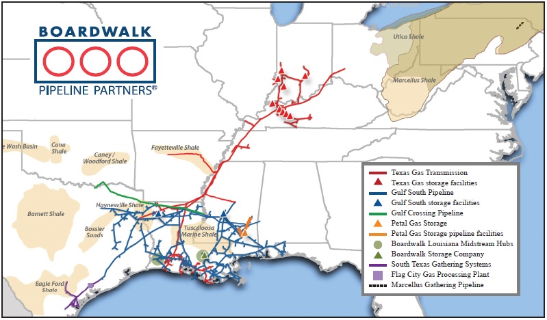 Los activos de Boardwalk se encuentran principalmente en Texas y Luisiana. Históricamente las zonas por donde entraba el gas natural a Estados Unidos para redistribuirlo por el resto del país, la compañía se vio bastante afectada por los cambios en el flujo del gas que produjo el enorme crecimiento de las extracciones no convencionales. Siendo actualmente la formación Marcellus la principal zona de producción de gas de Estados Unidos (nordeste de Estados Unidos), los estados más céntricos han quedado inundados de gas natural, lo que primero hizo innecesario su transporte desde el Golfo de México, para finalmente terminar revertiéndose el flujo del gas. Es decir, antes el gas entraba por el Golfo de México (es donde estaba la producción y las plantas de regasificación) y ahora es por donde va a salir (las plantas de regasificación para importar se están reconvirtiendo en plantas de licuefacción para exportar), además de que es donde se ubica la mayor concentración de industria intensiva en uso de gas natural.
