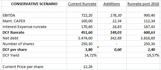 En el escenario más conservador, si simplemente se mantuviese la rentabilidad de los activos existentes en los niveles actuales y las nuevas inversiones tuvieran una rentabilidad del 12% a nivel EBITDA (en el rango bajo de las estimaciones de la compañía), los resultados post inversiones (a partir de la segunda mitad de 2018) deberían ser aproximadamente los siguientes: