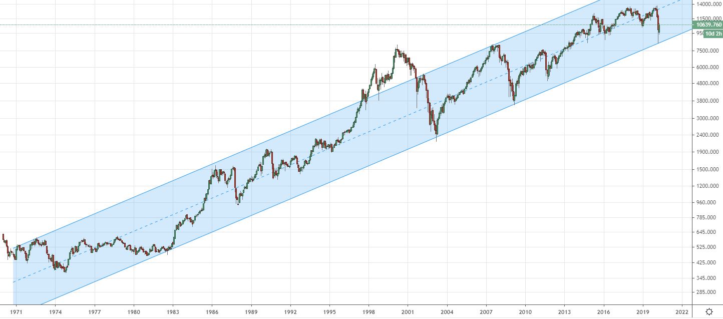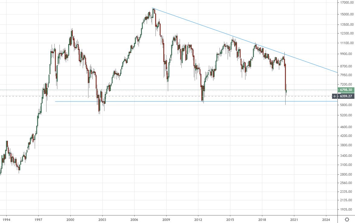 La macro tendencia en Alemania ha sido claramente alcista en las últimas décadas y esta crisis ha provocado que el mercado se vaya a la parte baja del canal creado por Alemania durante décadas.