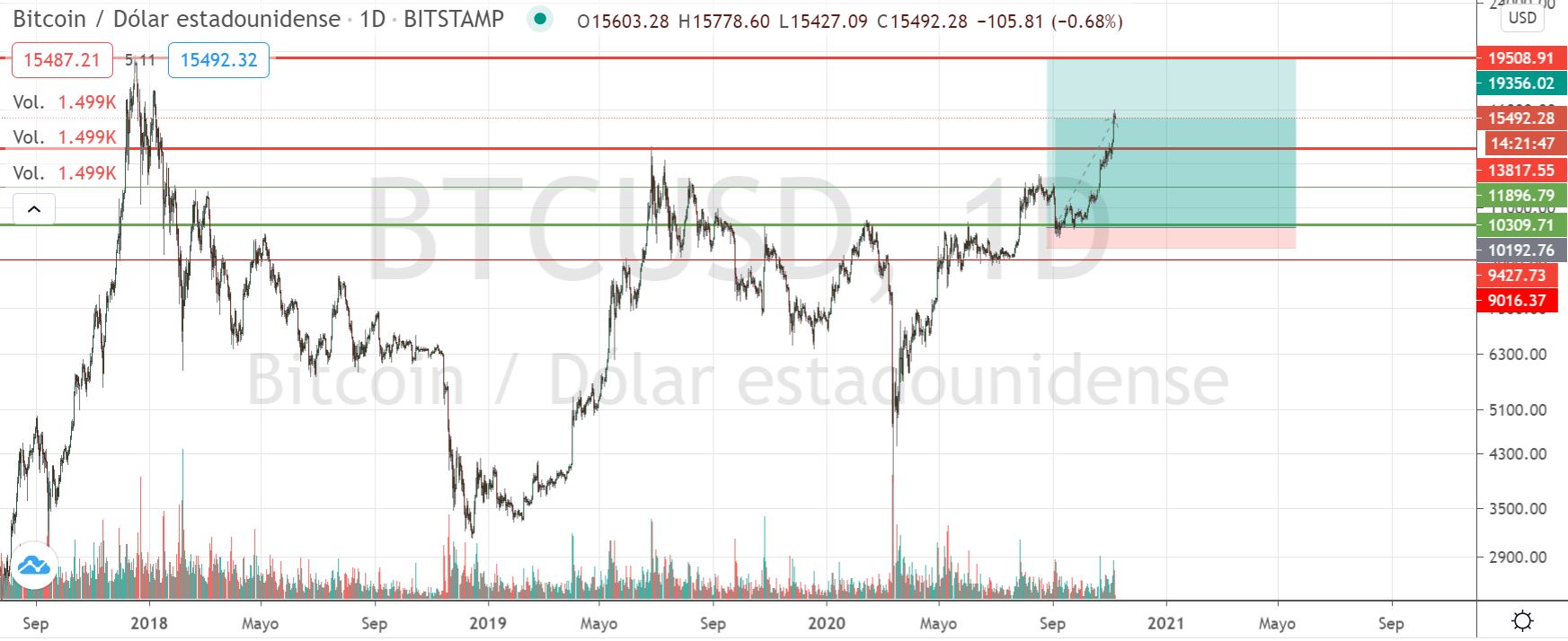 Viendo el precio en 15.000$ parece interesante entrar, pero la parte mala es que no tenemos donde ubicar un Stop Loss que reduzca nuestros riesgos. En mi opinión ahora ya no es momento de entrar. Es momento de esperar a otra oportunidad como la de los 10.000$.
