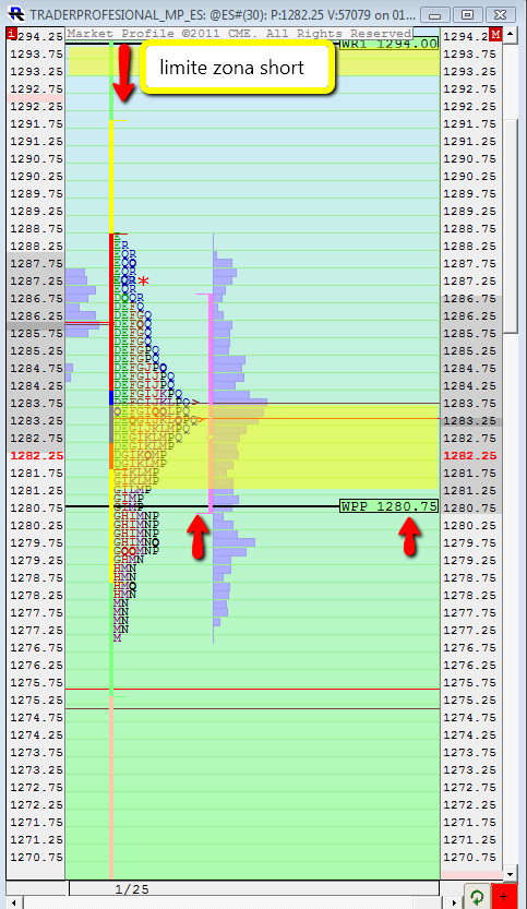 En la sesión de hoy tenemos como punto clave en la zona corta el 1294, como hemos citado en días previos. Ayer el precio se detuvo muy bien en la zona que teníamos para short intradía, pero con la entrada del volumen de última hora el precio volvió a dar señales de querer ir a máximos y así lo ha hecho en el perfil 24h, donde se ha parado en 1294.50. Si la zona de 1294 es rebasada por más de 3 puntos podemos pensar que el precio tiene recorrido como mínimo hasta la segunda resistencia semanal en 1308.25.