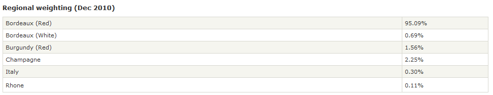 Como podeis ver el índice se parece más al Ibex 35 que al S&P 500 , al tener concentrado en el vino tinto de Burdeos, el 95% de su peso