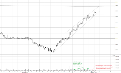 Hoy hemos tenido una primera vela excelente, un volumen elevado y una vela alcista cerrando en los máximos, pero ¿Cómo puede ser que las dos siguientes sean bajistas? La única explicación es que el volumen de la primera vela sea de ventas, puesto que un volumen alto de compras en plena tendencia alcista debería llevarnos a precios más elevados.