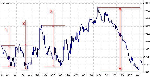 Este sistema de trading dejará de funcionar en el momento que tengamos un Drawdown superior al que hemos hecho en el backtest. El drawdown se calcula cogiendo el valor más alto que hemos llegado a tener en capital, por ejemplo 1.300 $ hasta el valor mínimo de capital (1.100 $) después de este máximo. Veamos un gráfico donde se entenderá mejor.
