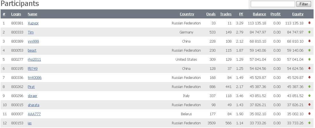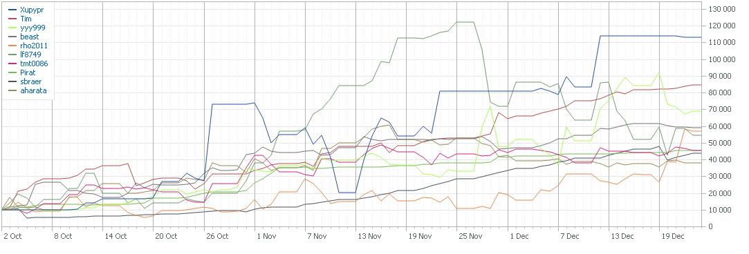 En este gráfico se puede apreciar que capital tenían los 10 primeros clasificados durante el concurso. Hay algunos que tienen unos gráficos que a más de uno y a mí, nos daría un ataque al corazón. No debemos fijarnos en esos robots, ya que de la misma forma que ha podido quedar entre los primeros, hubieran podido quedar mucho más atrás. Debemos fijarnos en robots como el de Tim (el germano), segundo clasificado, con una línea constantemente alcista, y que si no llega a pinchar en los primeros días de concurso, a lo mejor hubiera sido el ganador. A parte de este robot, también existen excelentes robots pero que por X motivos no han podido llegar al pódium, aun así, son excelentes resultados.
