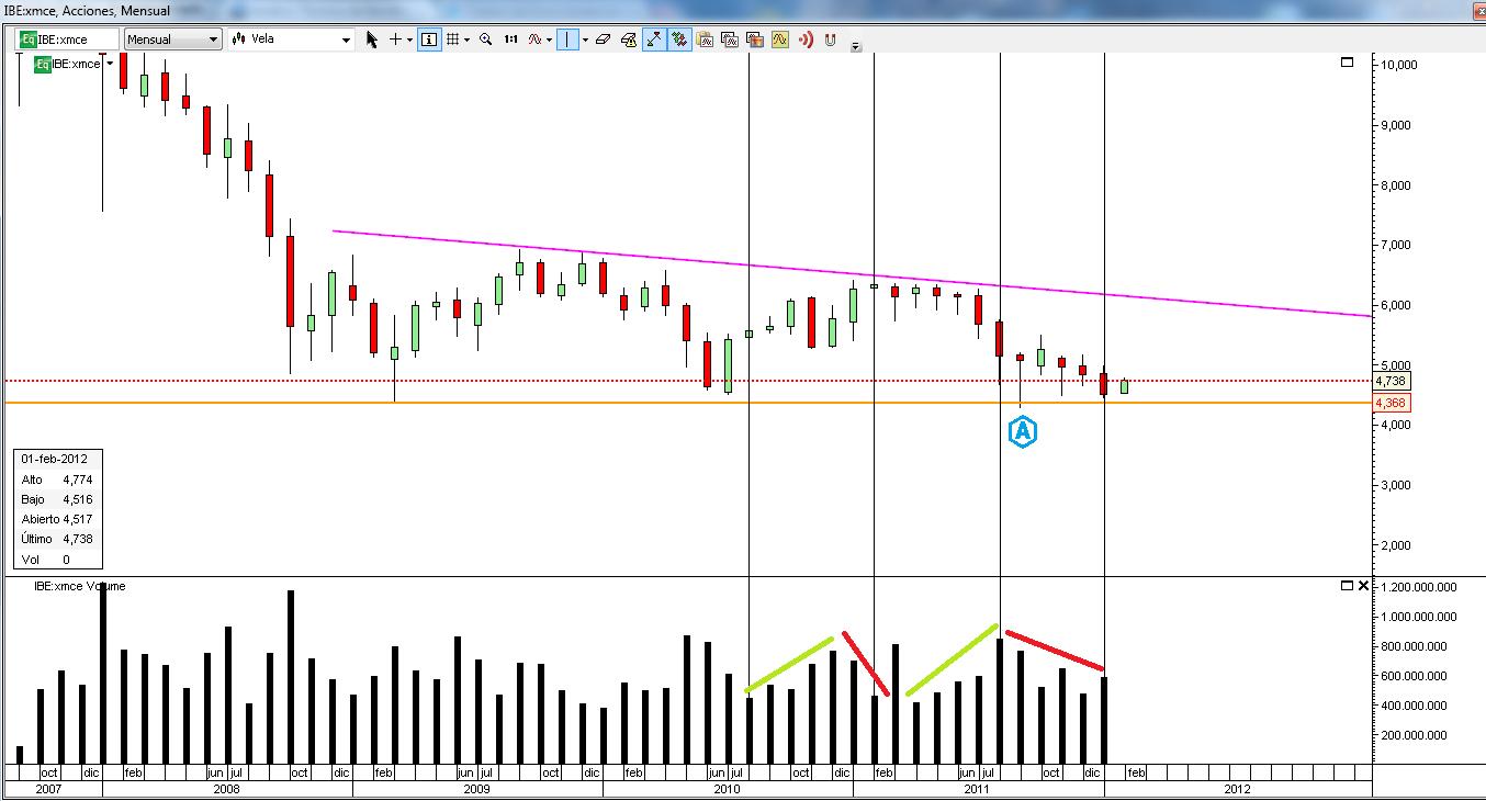 Respecto al volumen lo más importante lo he marcado con la letra A. Se puede observar como frenaron su caída, haciéndolo terminar prácticamente al precio de apertura (el volumen de esta vela es muy elevado), por lo que es bastante probable que el precio no caiga de los 4,40€ aprox. y se lance en busca de los 6-7€. El stop de protección de pérdidas lo colocaríamos alrededor de los 4€.