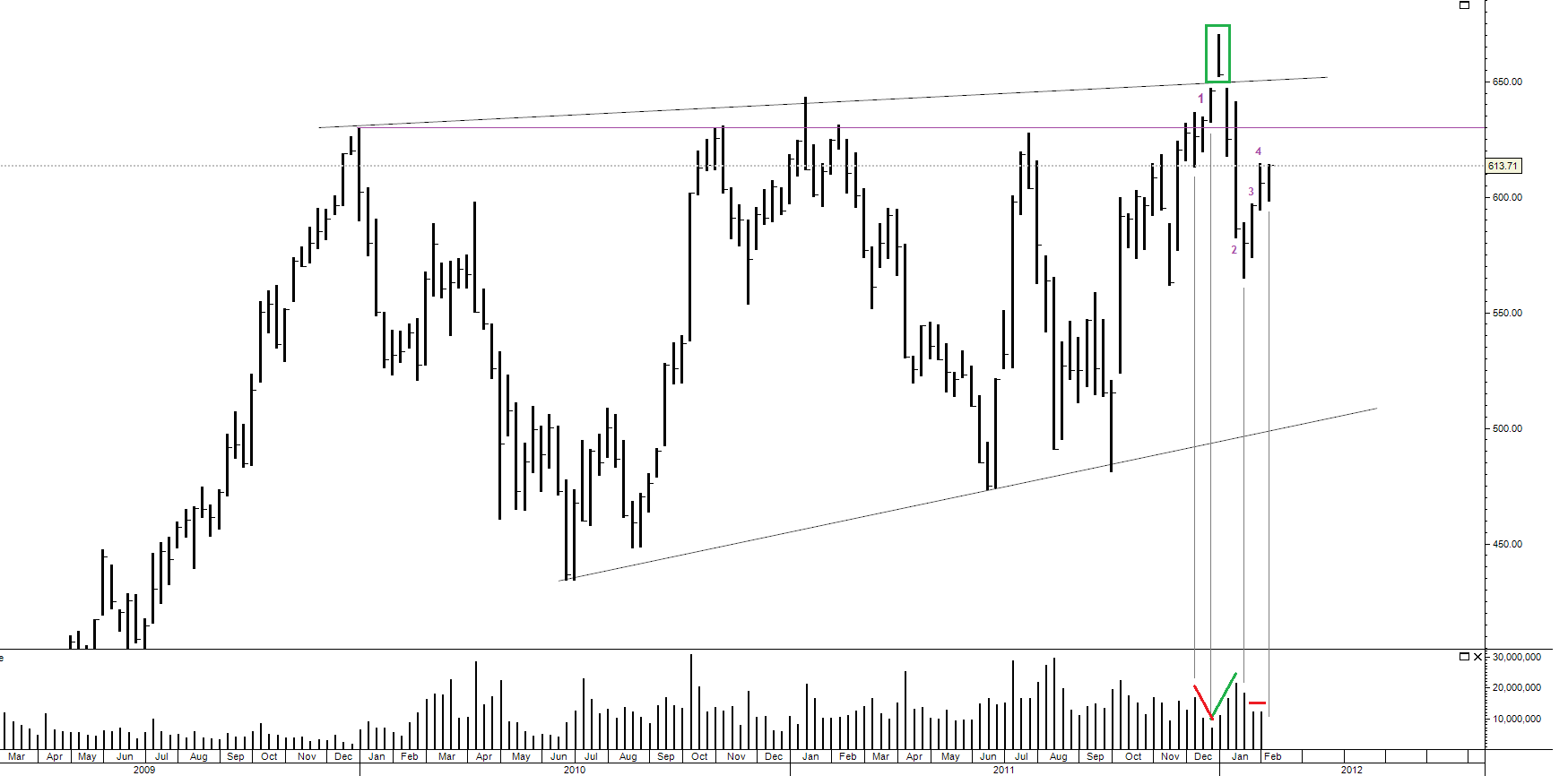 1 – En esta zona se pueden observar 3 velas consecutivas que hacen nuevos máximos y además rompemos unos máximos importantísimos, con estas 2 condiciones solo puede haber una respuesta por parte de la multitud… ¡¡¡¡¡EUFORIAAAAAAAAAA!!!!! Estoy convencido que no faltaban en ese momento análisis técnicos y fundamentales a favor de Google y de su (como siempre) infinito potencial de crecimiento.