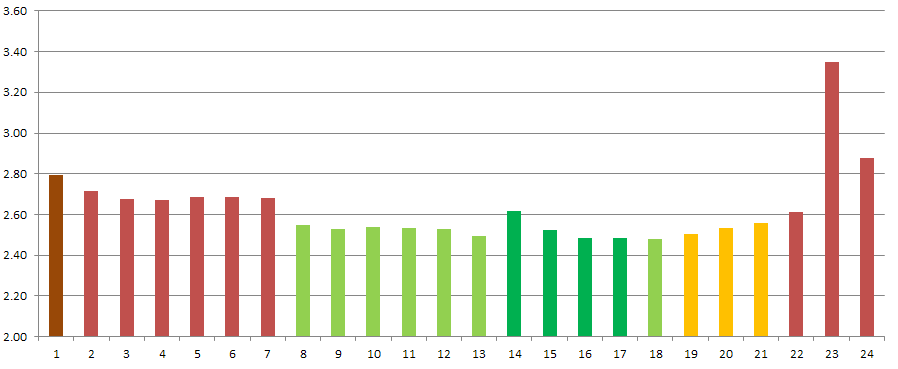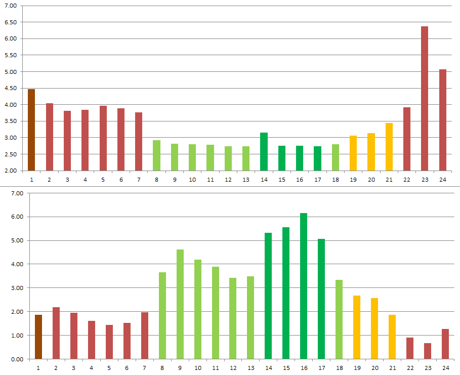Estamos de acuerdo que todos queremos pagar menos y Forex es un mercado con Spread variable, es decir, se pagan comisiones distintas según la hora del día. Después de hacer algunos cálculos, aquí tenéis las horas con mejor y peor Spread para EUR/USD.