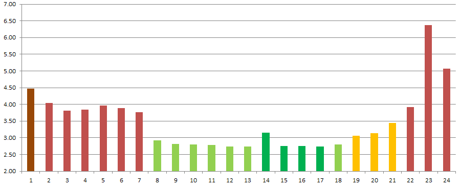 Podemos observar de nuevo cómo las horas europeas y las del overlap americano son las mejores, dejando las horas asiáticas con un spread casi de lujo (rozando los 4 pips). Ahora el aumento de spread ya no es del 10%, nuestros costes crecen entre un 45% y un 110% según la hora que elijamos, ¡mucho cuidado!