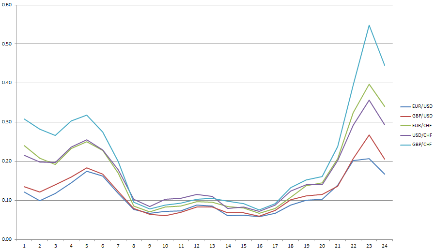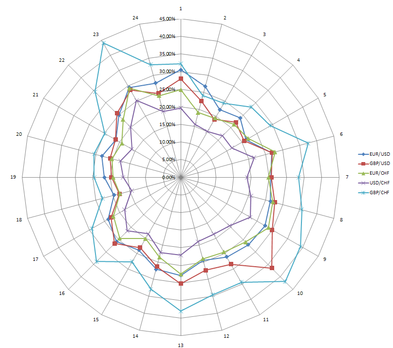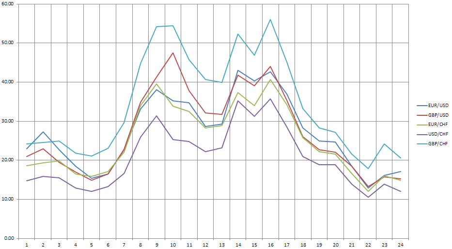 Al ver esta imagen nos damos cuenta que no solo importa el mercado que elijamos, también es clave elegir la hora correcta, sea cual sea nuestra elección las mejores horas serán las 8/9/10 y las 14/15/16. Mirando los mercados parece que el GBP/CHF ofrece unas oportunidades muy buenas durante toda la sesión europea, ¡su media no baja de 40 pips por hora! El USD/CHF es nuestra oveja negra y será mejor no intentar nada con él, ofrece una media de pips muy mala.