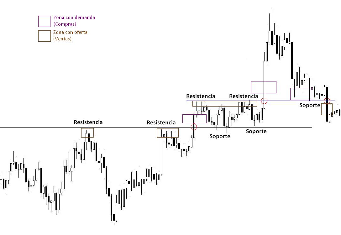 Profundizando un poco más la resistencia es aquél rango de precios donde encontramos mucha oferta, evitando que el precio suba. El soporte es la zona donde aparece mucha demanda, evitando que el precio baje.