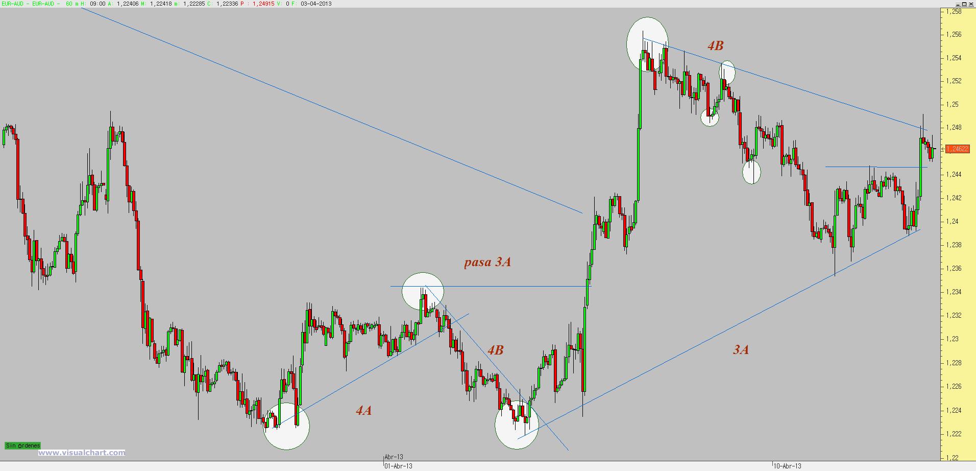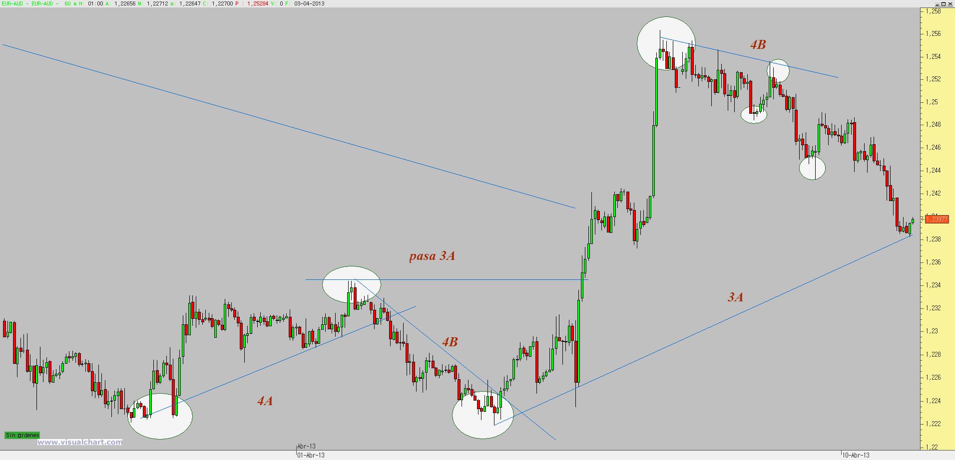 EURAUD aún no ha dado entrada y debemos seguir esperando; se acerca al soporte de cambio de tendencia de la terciaria alcista que esta en 1.2345 y eso me gusta más porque quizás de esta manera nos de más recorrido alcista. He vuelto a dibujar la directriz y la he trazado más abajo, puede no ser este el punto donde descansará la última cuarta, las cuartas duran más de un día y menos de una semana, con esto quiero decir que aún sigue vigente la cuarta bajista y puede durar algo más. Si seguimos siendo prudentes y esperamos el cambio a cuarta alcista podremos recoger algunos pips.