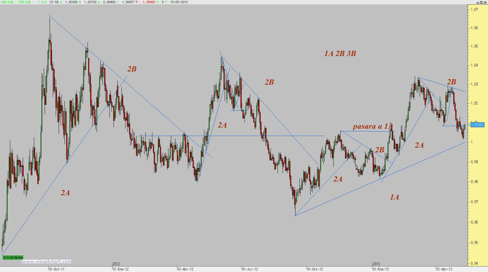 El 1 a 1 del USDCAD está muy cerca, si lo tocara estaría justo en la directriz de la primaria alcista. Si se apoyara en la directriz e hiciera máximos ascendentes podría hacer una cuarta alcista. No tenemos ni una figura hecha, solo me fio de la directriz y del 1, la fiabilidad de esta entrada esta solo para intradia de momento, si da algunas señales más claras se podría pensar en largos.