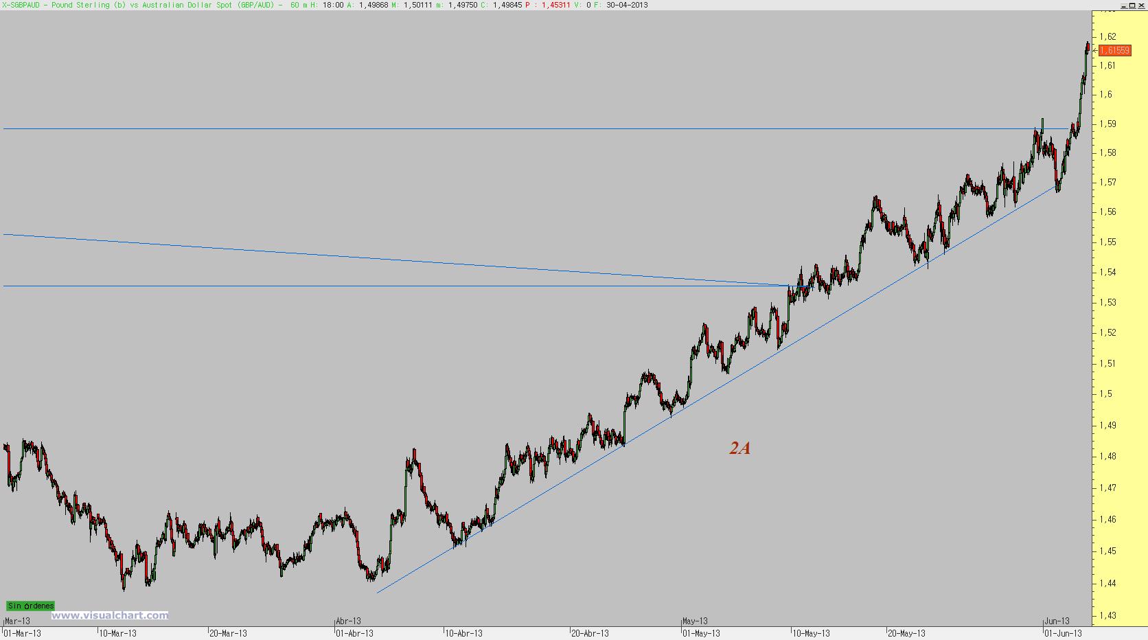 Esta última secundaria ha roto el máximo anterior de la última secundaria alcista, por ese motivo ha pasado a primaria alcista. Ha roto la directriz con 300 puntos de subida vertical, puede recortar un poco y volver a la rotura pero no estoy tan seguro de que lo haga porque todos los Dólares Australianos están tiritando y sin fuerza. Aquí tenemos varias opciones de trabajar con las Libras, y todas son buenas. Solo les puedo decir... Saltar canguros y no os piséis las pelotas.