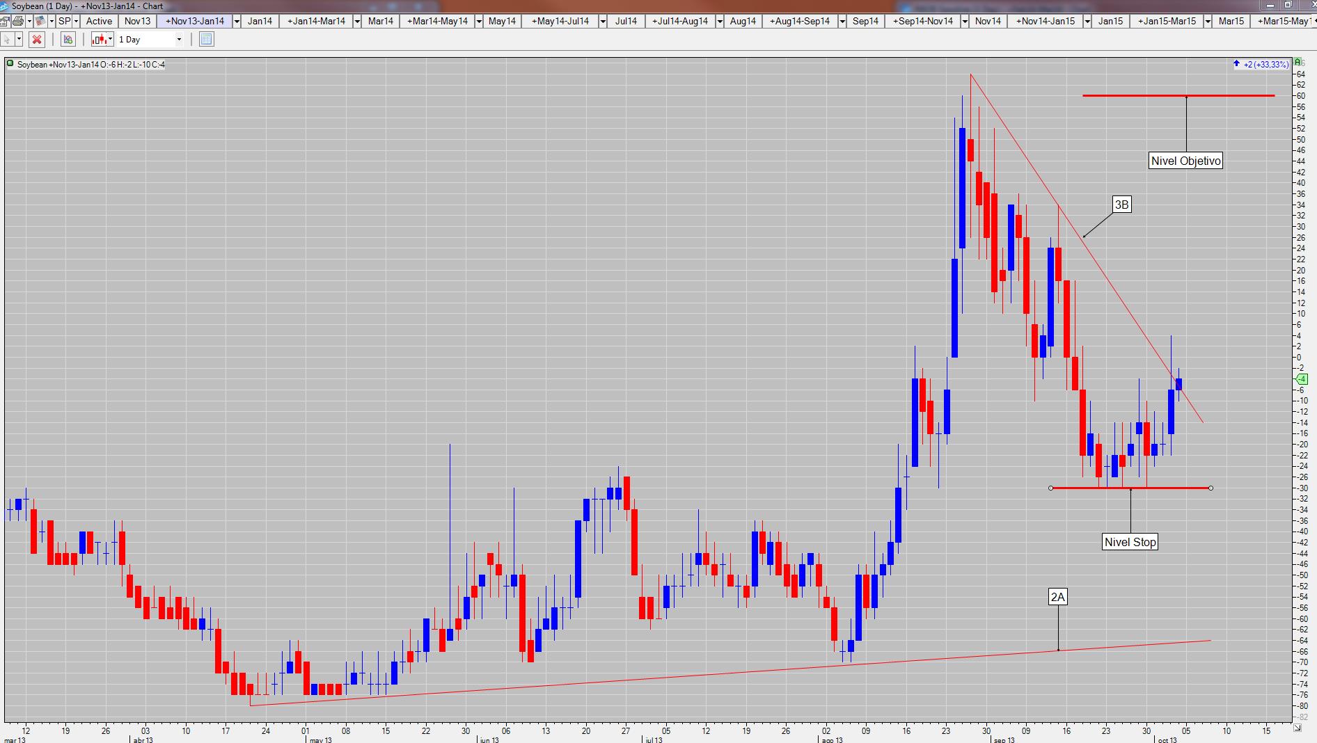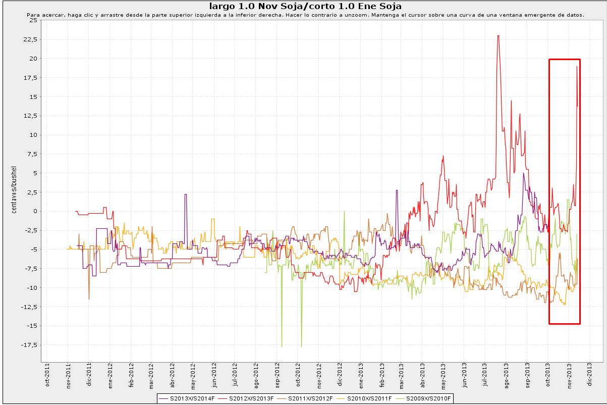 La estrategia que vamos a proponer en esta ocasión es la compra de un calendar spread de soja (ZS) Noviembre 2013 - Enero 2014. Su gráfico es el siguiente: