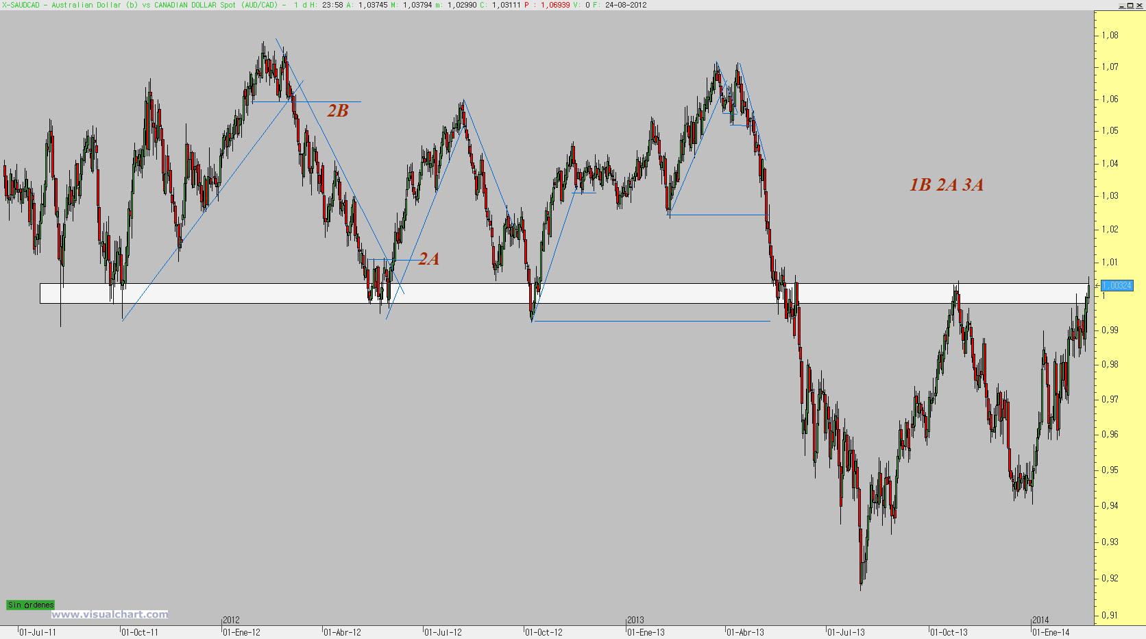 El Dólar Australiano contra el Dólar Canadiense está en un momento esplendido para ser vendido; está tocando el máximo de la última secundaria alcista, en caso de que lo rompa la perdida sería muy limitada, y si no rompe ese máximo y comienza otra secundaria bajista tendremos un camino muy bueno durante bastantes meses para ir incrementando lotes cada vez que se acerque a un máximo anterior o siga haciendo mínimos.