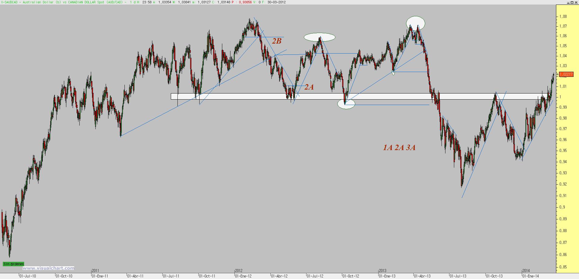 El Australiano contra el Canadiense ha pasado a primaria alcista al romper el máximo de la secundaria alcista anterior; esta secundaria se mantuvo alcista durante tres meses, luego hizo una secundaria bajista de dos meses para hacer otra secundaria alcista y romper el máximo anterior, y así dar paso a la primaria alcista que comenzó el 31/07/ 20013.