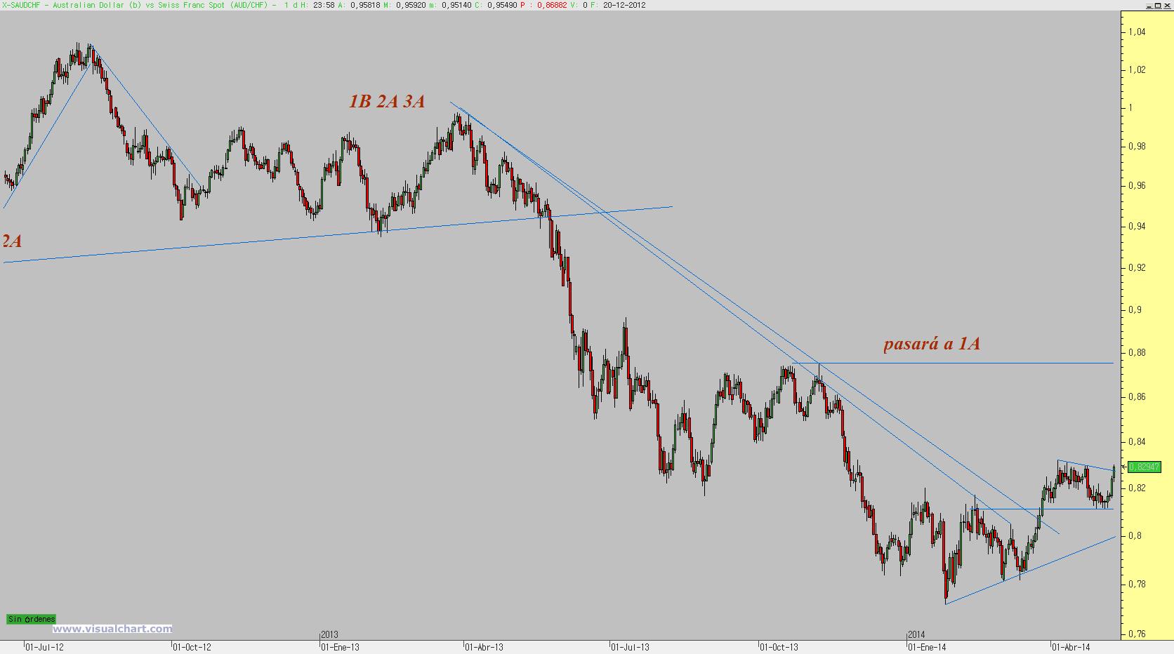 El Dólar Australiano está haciendo máximos y mínimos crecientes, entro en secundaria alcista al romper el máximo de la terciaria alcista anterior, y entró en terciaria alcista al romper el máximo de la cuarta alcista anterior; una secundaria alcista dura más de dos meses y menos de un año, y una terciaria un mínimo de diez días y máximo de treinta días.