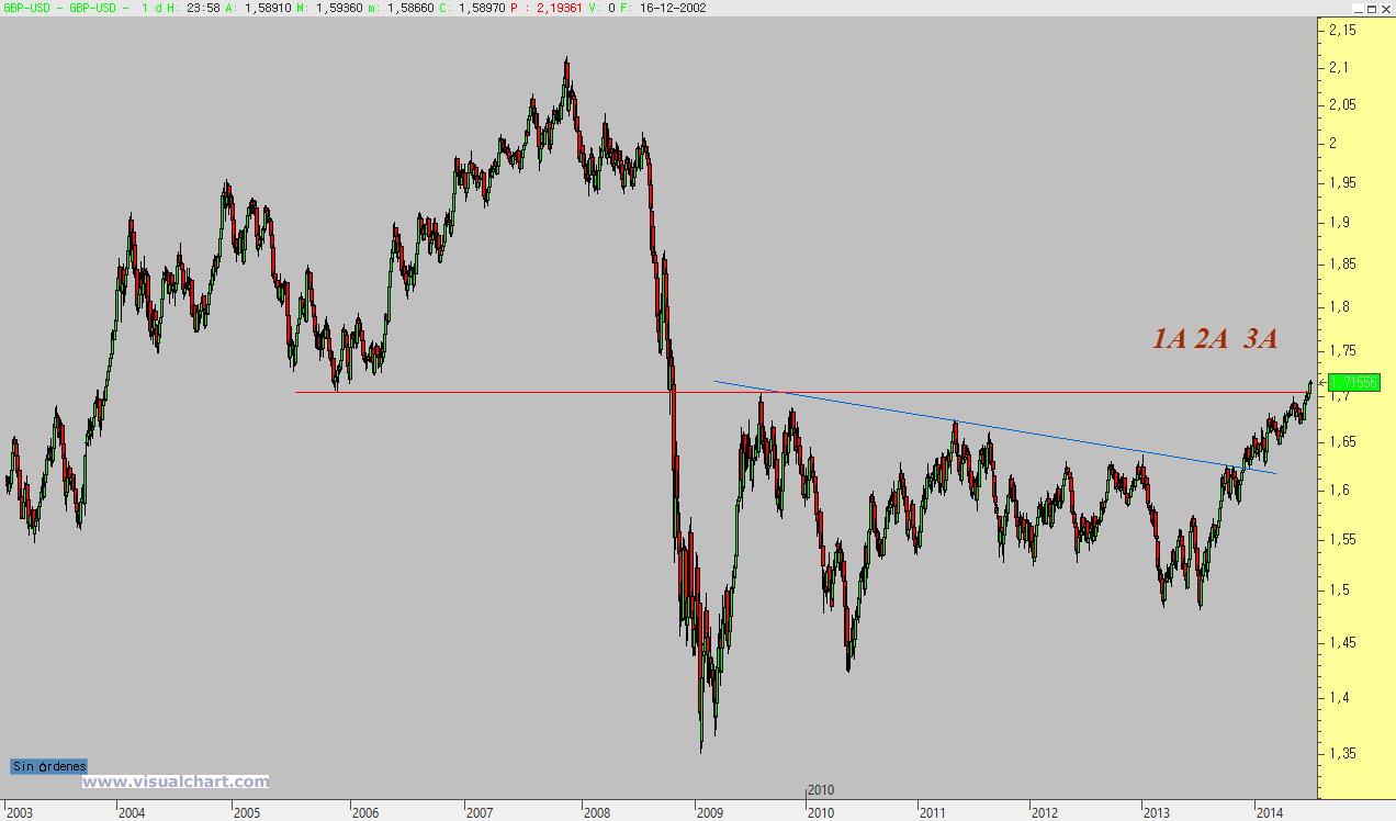 La libra contra el dólar ha roto la resistencia psicológicamente dura de 1,70 traspasándola como si fuera mantequilla; la rotura nos indica una dirección obvia de la Libra, claro que, eso será mientras no empiece el precio a dar vueltas y a moverse de manera errática.
