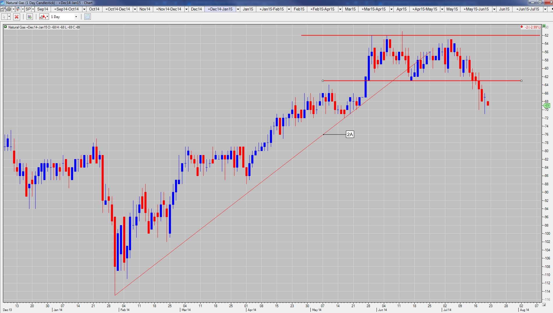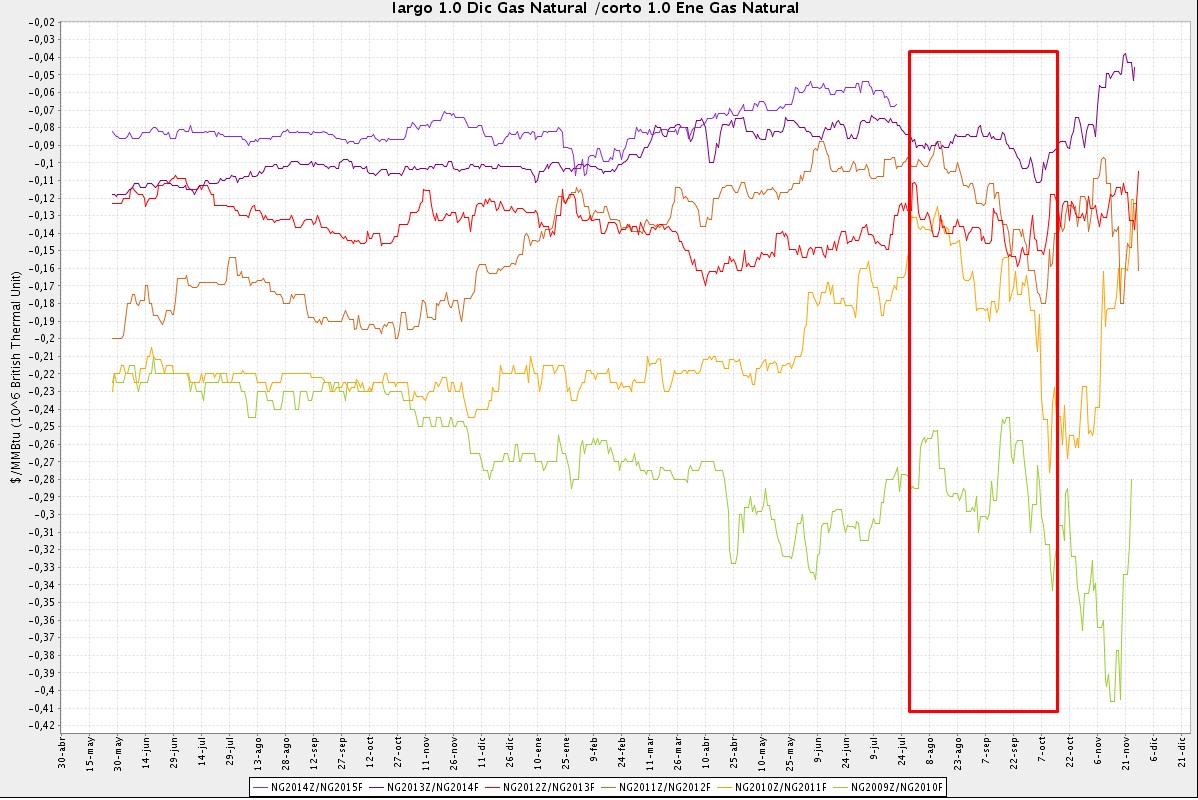 En este caso propongo la idea de vender el spread de Gas Natural (NG) Diciembre 2014 - Enero 2015, pues cumple todos los requisitos que le pedimos a una operación para considerarla seriamente: estacionalidad favorable evidente en los últimos años, figura gráfica que indica una probable próxima tendencia en la misma dirección que la estacionalidad y un ratio riesgo recompensa mínimo de 1:4.