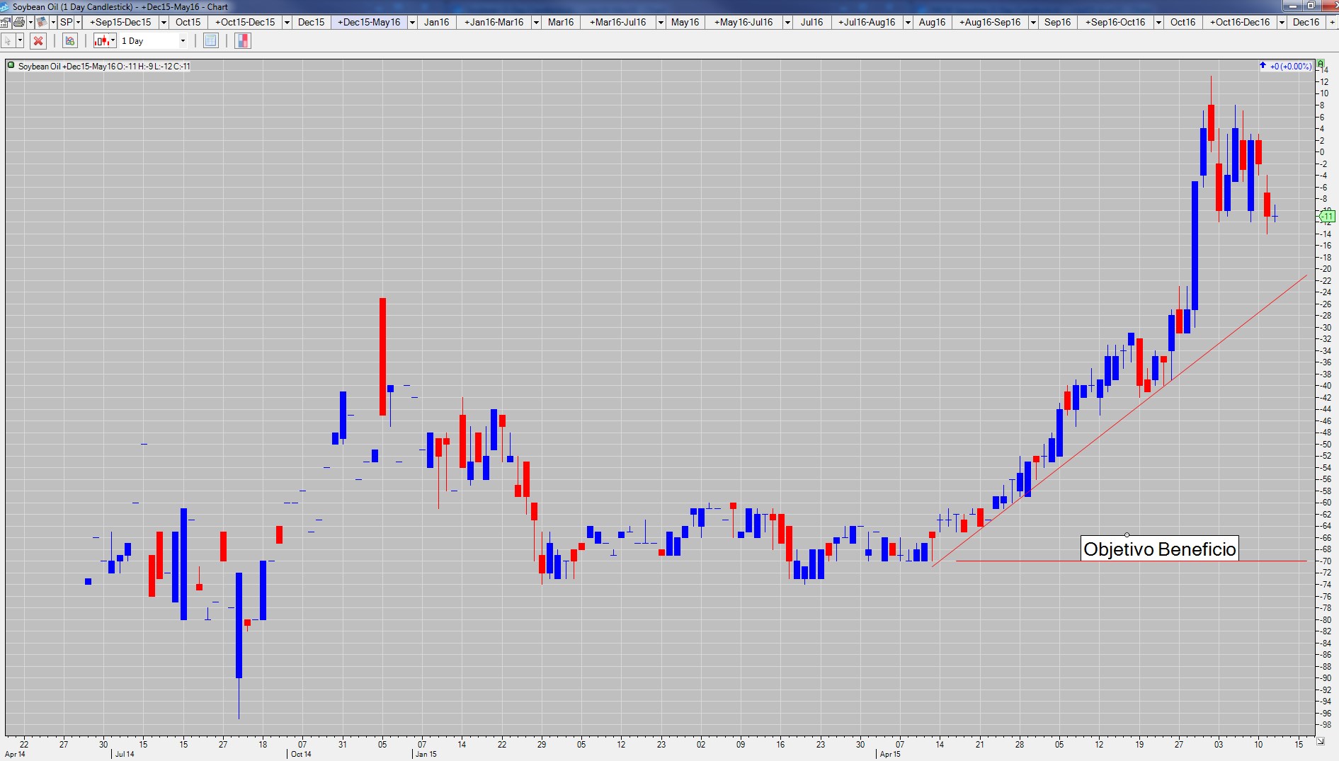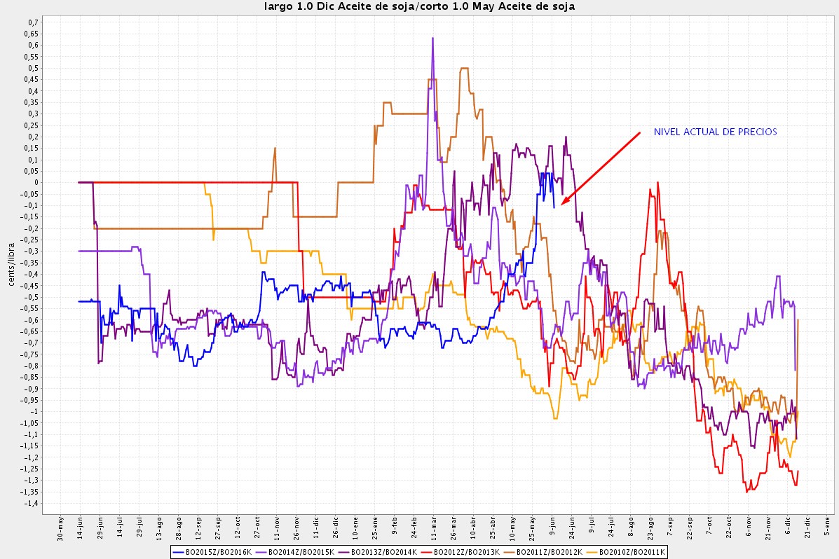Propongo la venta del spread formado por los contratos de Diciembre 2015 y Mayo 2016 de Aceite de Soja (ZL). Es decir, para quien opere por patas, se vende el contrato de Diciembre y se compra el de Mayo. Ésta es su situación actual: