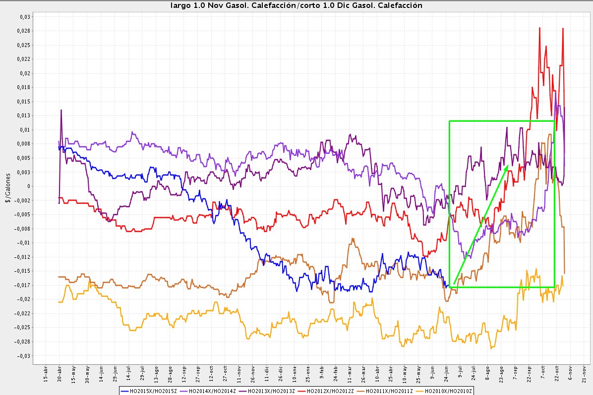 Propongo la compra en estos momentos del spread formado por los futuros del Heating Oil Noviembre - Diciembre 2015. Es decir, compramos el futuro de Noviembre y vendemos al mismo tiempo el futuro de Diciembre. Veamos en el gráfico estacional cómo se ha comportado este spread desde estas fechas hasta vencimiento en los últimos años: