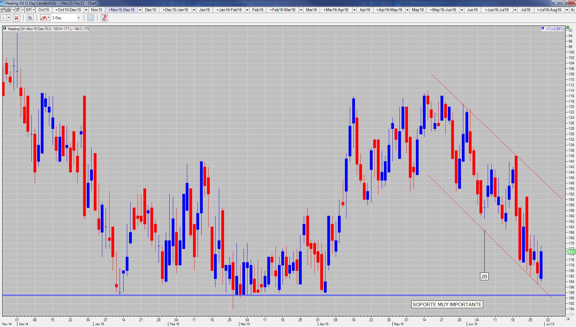 Vamos a introducir un spread basado en el Gasóleo de Calefacción (HO - Heating Oil por sus sus siglas en inglés). Al igual que en el caso de la gasolina, cada punto entero en uno de estos futuros equivale a 42.000 dólares. Antes de que nadie salga corriendo, hay que aclarar que cotizan hasta la diezmilésima (que equivale a 4,2 dólares) y que en un movimiento diario habitual no suelen moverse en un rango mayor de 20-30 diezmilésimas.