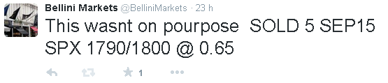 SPX Sep15 1850/60 con Delta 23 y 77% probabilidad de terminar fuera del dinero tundra que ser cerrada si llegamos a Delta 30. Para paliar la pérdida intentaré vender PS de en 1690/1680.