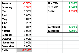 En lo que llevamos de 2016 el SPX marca un rendimiento positivo del +2.89% y el RUT del 1.84%. Bellini sin embargo sigue en territorio negativo pero solo del -0.536% depues de cerrar las posiciones de Junio y Julio.
