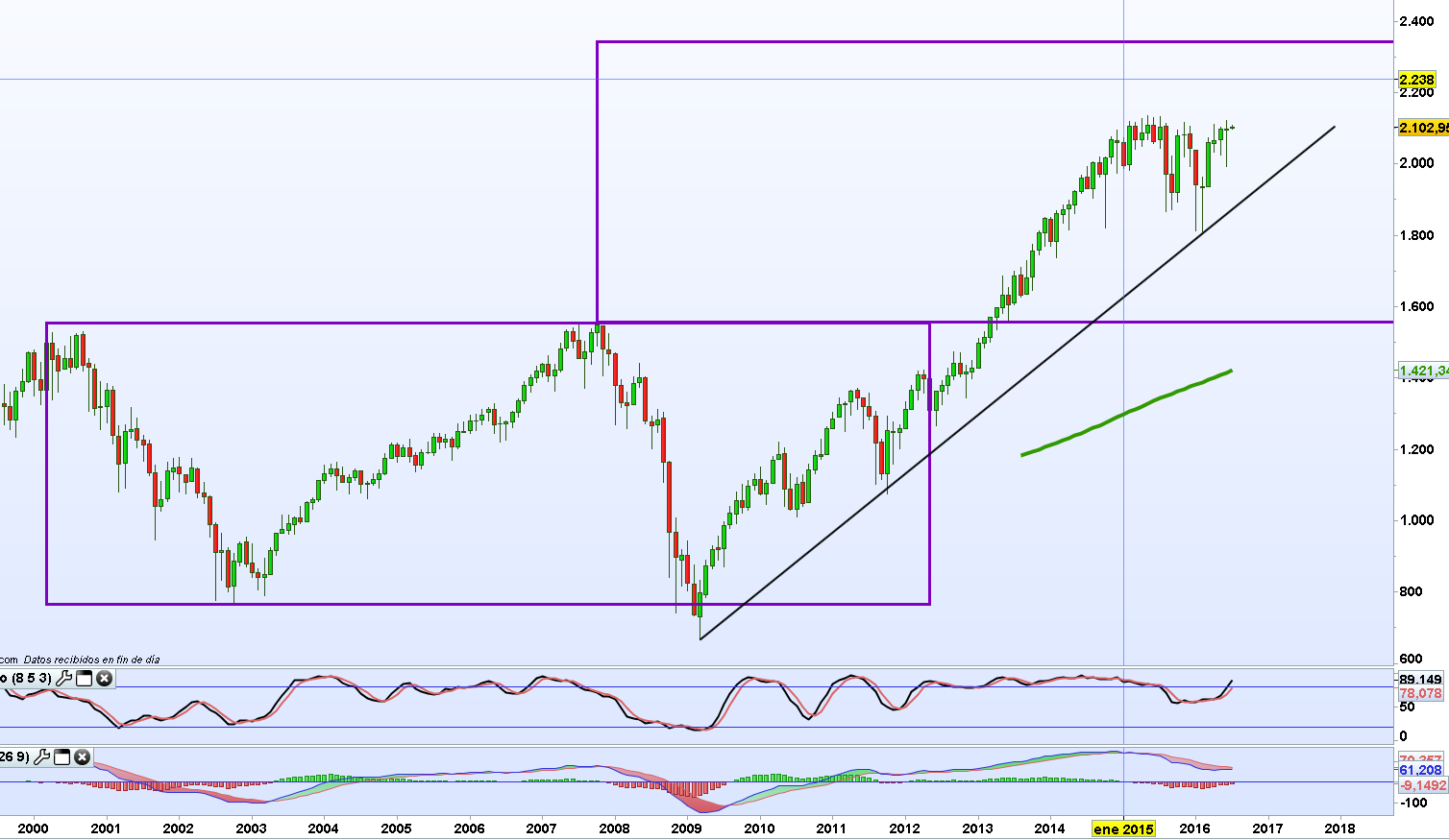 El gráfico mensual del SPX muestra la fortaleza del índice desde 2009. Observamos como desde hace año y medio se mueve de manera lateral con soporte en los 1800 y resistencia en los 2100.