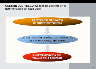 Por tanto, y a modo de resumen en el desarrollo de este tema, diríamos que el control del riesgo es la principal tarea en el desarrollo de la operativa de un trader, que el stoploss debe ser determinado en función de criterios técnicos, pero sujetos a la restricción de que la pérdida resultante no supere el 2% del capital en cuenta, y que la ejecución del mismo debe ser automática, delegando el trader en esta tarea a los sistemas automáticos desarrollados a tal efecto.
