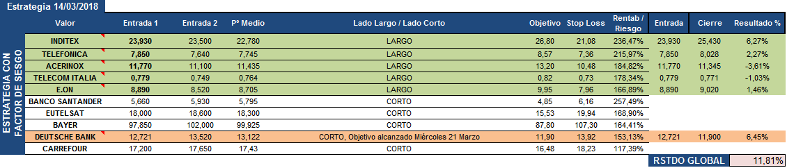 Dado que en el periodo Swing objeto de la Estrategia, el mercado se mantuvo lateral al principio, para caer ligeramente al final del mismo, de los vehículos para Trading Baja, sólo la posicion corta del Deutsche Bank entró en Precio, y fué únicamente este valor el que alcanzó la zona objetiva propuesta. Los 5 valores para Trading Alza seleccionados entraron en precio en la fase de caída en su primer nivel propuesto. Con todo el resultado Global de la Estrategia podemos calificarlo de bastante satisfactorio, probando correcta en su conjunto, tanto la selección de valores en función del Sesgo Swing obtenido, como los niveles de entrada propuestos. De los 6 instrumentos que entraron en precio, 4 acabaron en positivo, y 2 en negativo a precios de cierre del pasado 30 de Marzo, por lo que el Porcentaje de Acierto para esta Quincena sería del 66.67%.